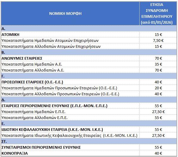 Το ύψος των επιμελητηριακών συνδρομών βάσει της υπ’ αριθ. 78030/30.12.2014 (ΦΕΚ 3586/Β/31.12.20214) Υπουργικής Απόφασης διαμορφώνεται ως ακολούθως ανάλογα την νομική μορφή της επιχείρησης: